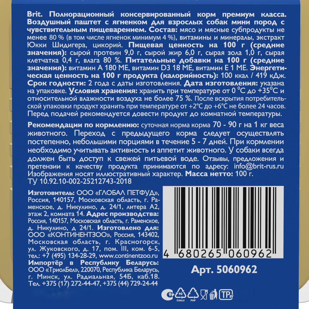 Корм Brit Sensitive Mini Lamb (паштет) для собак малых пород с чувствительным пищеварением, с ягненком, 100 г