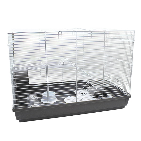 Укомплектована пластиковыми кормушкой и поилкой, колесом, домиком, лесенками.