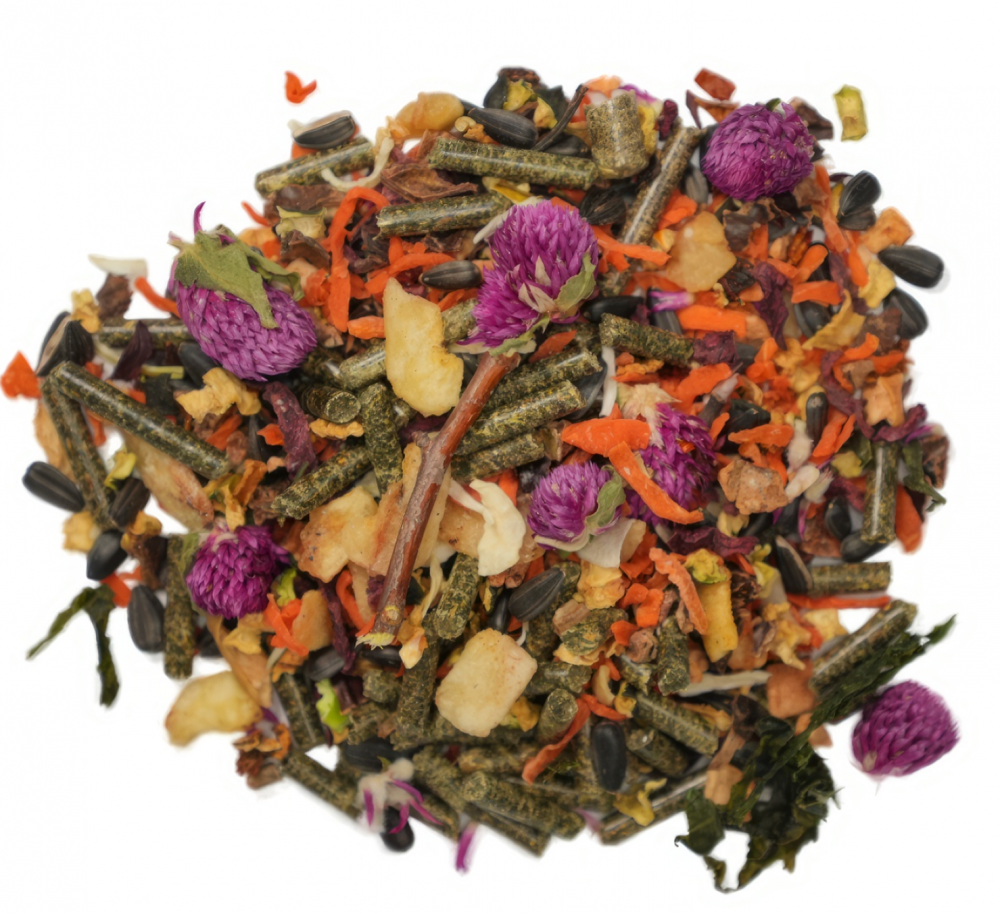 СОСТАВ: гранулы из смеси трав (райграсс, тимофеевка, мятлик), мультивитаминные гранулы (зернопродукты, травяная мука, свекловичный жом, дрожжи, витаминно-минеральный премикс), гранулы из люцерны, плющеный горох, семечки подсолнечника, кусочки кэроба, морковь, свекла, чипсы банана, паприка, цуккини, сушеный лук, сушеные яблоки, цветы клевера, березовые веточки, ламинария, юкка шидигера, комплекс пробиотиков, натуральный адсорбент – дрожжи (S.cerevisae). Питательная ценность на 100г : белки 12,74%, жиры 3,19%, углеводы 26,87%, клетчатка 10,68%, зола 3,44%, полиненасыщенные жирные кислоты (включая Омега 3-6-9) 1,99%, влага 4,50%, кальций 101,61 мг, фосфор 236,04 мг, калий 829,75 мг, медь 0,47 мг, марганец 1,39 мг, цинк 3,07 мг, Витамин А 33,56 мкг, Витамин С 10,61 мг, Витамин В1 0,87 мг, Витамин В3 13,36 мг, Витамин В12 1,21 мкг Энергетическая ценность на 100 г: 92,56 ккал.