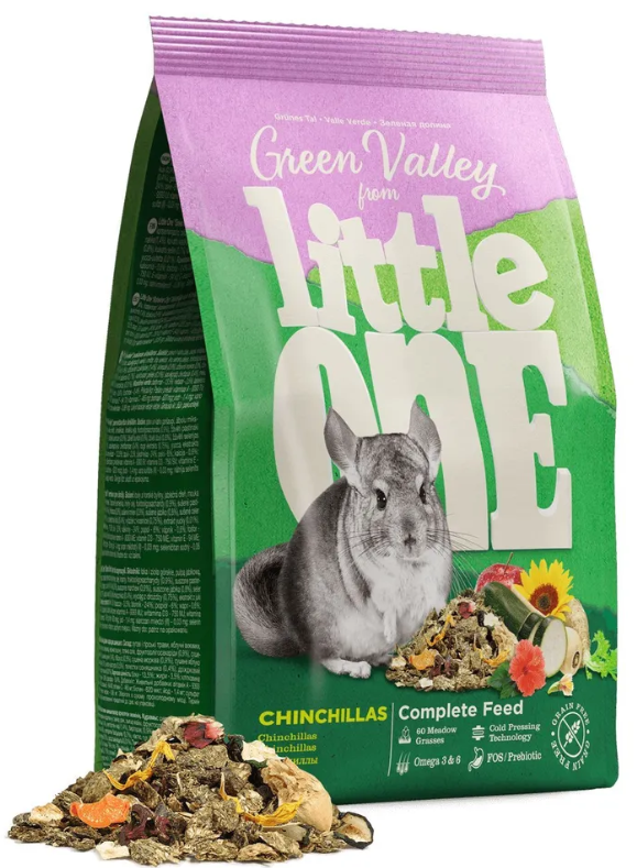 Little One корм "Зеленая долина" для шиншилл - корм для декоративных животных, в состав которого входит 60 разновидностей трав. Изготовленный с помощью специальной технологии холодного прессования, корм сохранил все витамины, минералы и другие ценные питательные вещества, входящие в состав растений. Корм богат длинными волокнами клетчатки, что обеспечит необходимый уход за зубами и правильное пищеварение у шиншилл. Рацион обогащен фруктоолигосахаридами - натуральными пребиотиками, которые поддержат рост полезной микрофлоры в кишечнике. Жирные кислоты ω-3 и ω-6, содержащиеся в корме, обеспечат здоровье кожи и сделают шерсть питомца густой и блестящей. Дрожжевой экстракт, богатый витаминами группы В, селеном и β-глюканами, окажет благотворное влияние на иммунную систему. Для разнообразия рациона шиншиллы в состав корма входят вкусные и полезные добавки - сушеные цветы, фрукты, овощи и ягоды. Не содержит зерновых компонентов, что прекрасно подходит для диетического питания животных, в том числе страдающих от избыточного веса и других заболеваний. Не содержит красителей, ароматизаторов, ГМО. Ингредиенты: Луговые и горные травы Яблочные выжимки Мука из семян подсолнечника Семя льна Льняное масло Фруктоолигосахариды (0,9%) Сушеный пастернак (1,4%) Сушеный цуккини (1,4%) Гибискус (0,9%) Сушеная морковь (0,9%) Сушеное яблоко (0,8%) Сушеный сельдерей (0,7%) Цветы кактуса (0,5%) Лепестки подсолнечника (0,4%) Дрожжевой экстракт (0,75%) Экстракт юкки (0,01%) Пищевая ценность: Белки — 13,5% Жиры — 3,5% Клетчатка — 24% Зола — 6% Кальций — 0,6% Фосфор — 0,4% Питательные добавки/кг: Витамин А — 9393 МЕ Витамин D3 — 750 МЕ Витамин Е — 94 МЕ Витамин С — 465 мг Биотин — 620 мкг Йод — 1,4 мг Сульфат меди (II) — 0,03 мг Селенит натрия — 0,06 мг Рекомендации по применению: Может быть использован без ограничений как основной корм, как источник сена, а также как дополнение к сену для разнообразия его ботанического состава. Подробнее