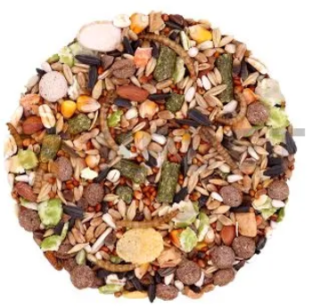 Состав: Пшеница, просо красное, экструдированная гранула (пшеница, кукуруза, яблоко, груша, мел природный, экстракт юкки Шидигера), голозерный овес, травяные гранулы, гречиха, семена подсолнечника, сафлор, ячмень воздушный, кукуруза, сорго, льняное семя, горох плющеный, морковь, кукурузные хлопья, яблоки, арахис, семена тыквы, мучной червь.