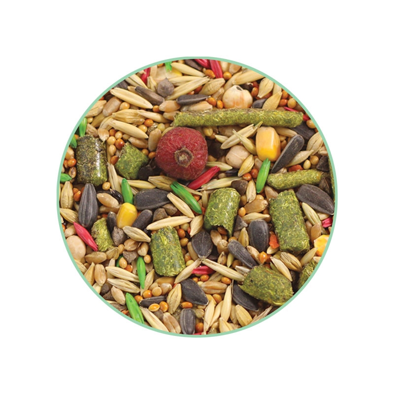 Состав: Пшеница, овёс, ячмень, просо белое, просо красное, семена подсолнечника, травяные гранулы, кукуруза, горох, гречка, суданка, попкорн, морковь, шиповник, витаминный комплекс