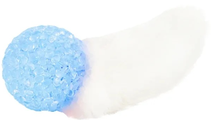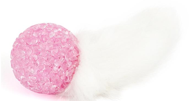 Привлекательная натуральная игрушка для кошек - высушенный кроличий хвост в шерсти, прикреплённый к пластиковому мячику с бубенчиком.