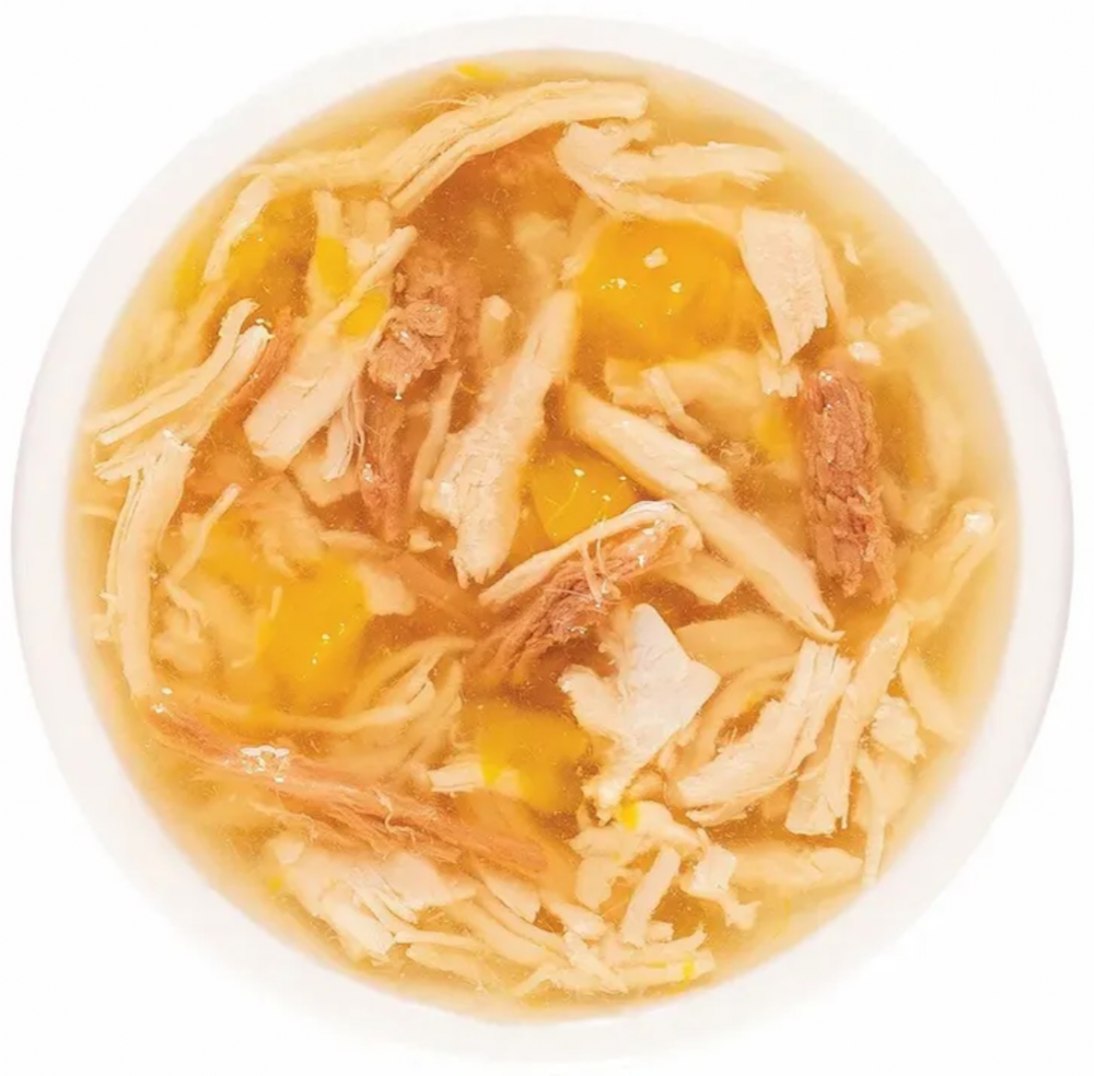 Состав:nкуриный бульон -71,3%, курица -20%, утка -4%, тыква-4%, желирующая добавка, экстракт тунца, витамин Е. Из-за использования на производстве возможны остаточные следы: кролика,баранины,говядины, курицы, индейки, рыбы, ракообразных, маллюсков, орехов, кунжута, молочных продуктов, сои, бобовых, злаков и их субпродуктов. Гарантируемые показатели (га 100гр): протеин - 10, жир - 0.2,клетчатка - 1, зола - 1,5, влажность - 89, 30,8ккал Норма кормления: вес кошки:1-3кг - 1пачка, 3-5кг - 2пачкиn
