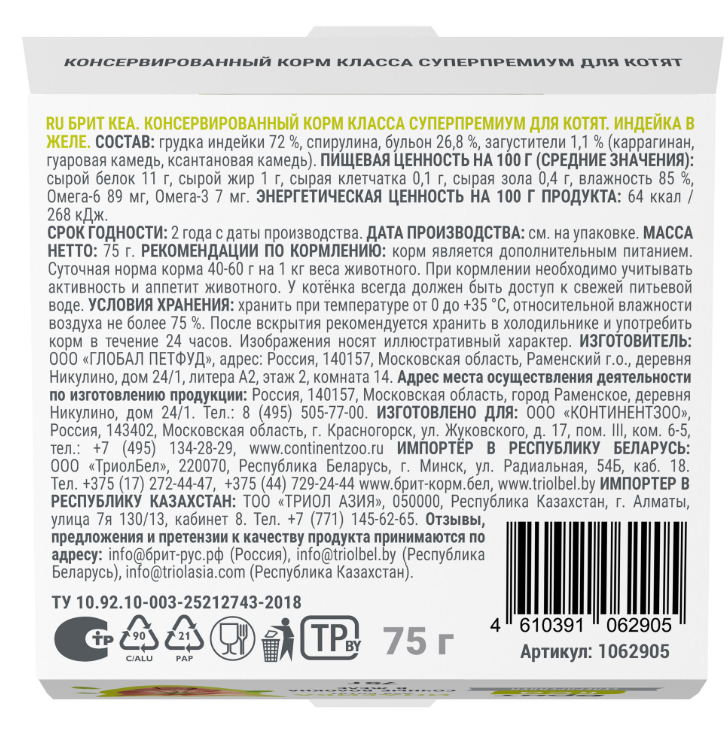 Вся линейка паучей и ламиcтеров Брит Кеа "Волокна в желе" построена на индейке как основном белке, с добавками разных морепродуктов. Это уникальная фишка линейки — моно-белковый состав на базе индейки + сочные волокна и желе, обогащенные спирулиной и таурином, создающие функциональное лакомство для взрослых кошек и котят. Мягкий