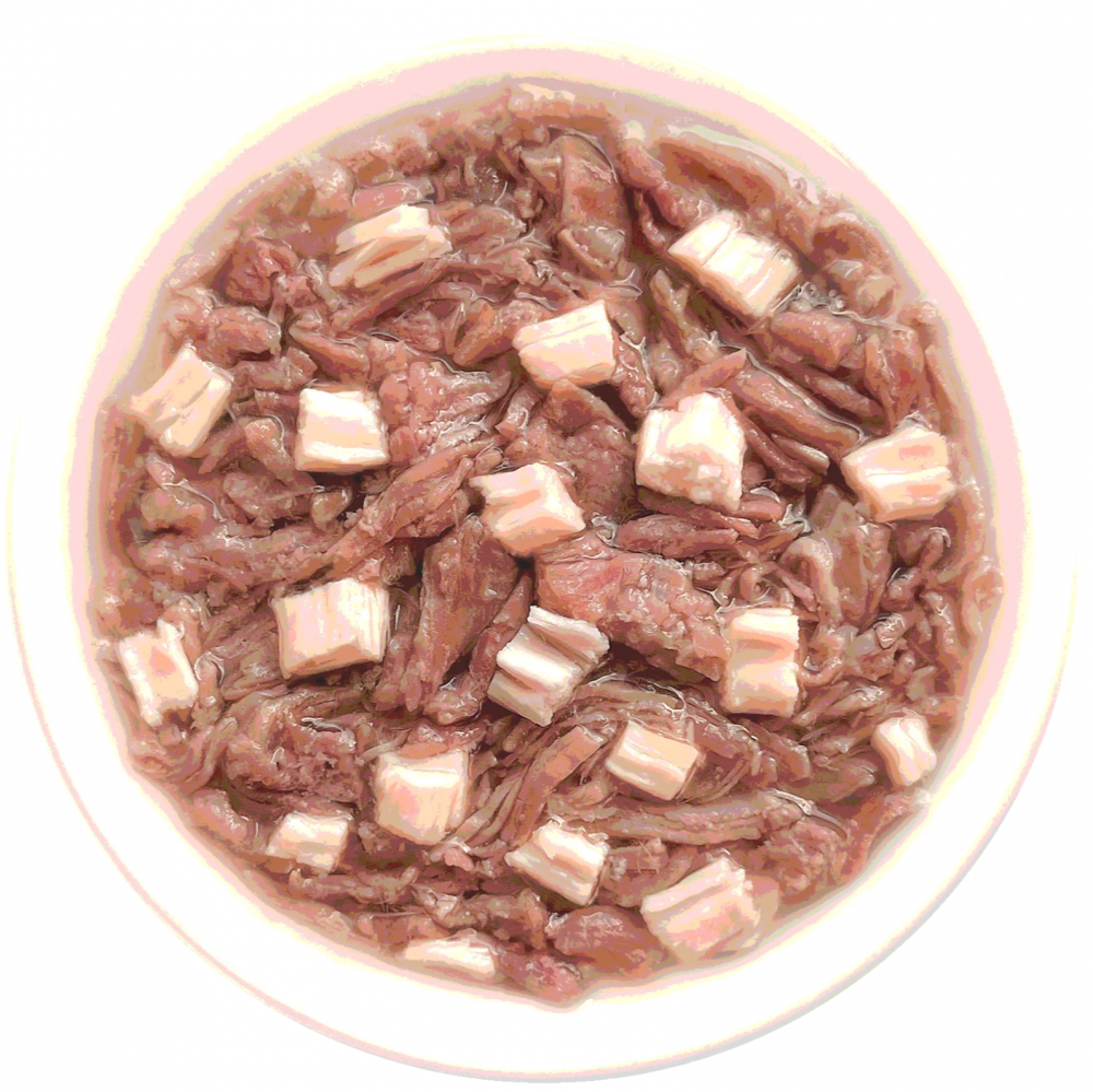 Состав: утка 54 %, кролик 6 %, бульон из утки 38 %, натуральная желирующая добавка.nПищевые добавки: пивные дрожжи (источник пребиотика МОС), пребиотик ФОС, рыбий жир (анчоус), витамин Е, таурин, минералы.nПищевая ценность, %: протеин — 11, жиры — 2, клетчатка — 1, зола — 1,5, влажность — 89; энергетическая ценность — 55 ккал.