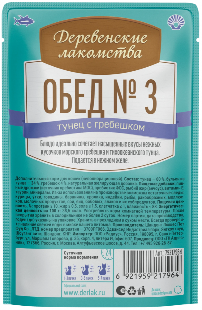 Консервированный влажный корм для кошек серии «Деревенские лакомства — Рыбные обеды» содержит большое количество мяса тихоокеанского тунца, которое идеально сочетается с насыщенным вкусом морского гребешка. Тёмное мясо тунца отличается нежной текстурой и более ярким ароматом, такое мясо насыщает корм вкусом морской рыбы.