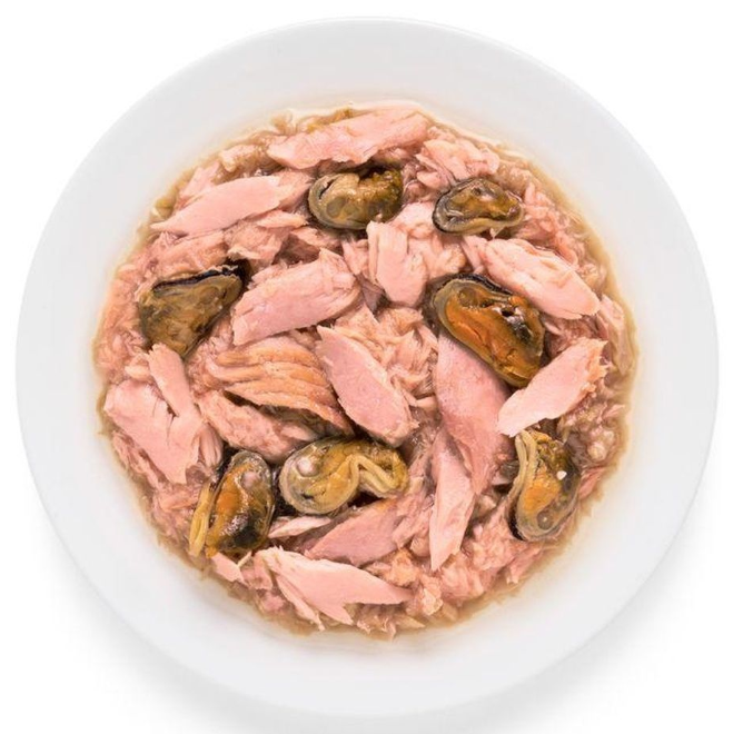 55% филе тунца, 20% мидии, 25% собственный сок, 0% зерновых.