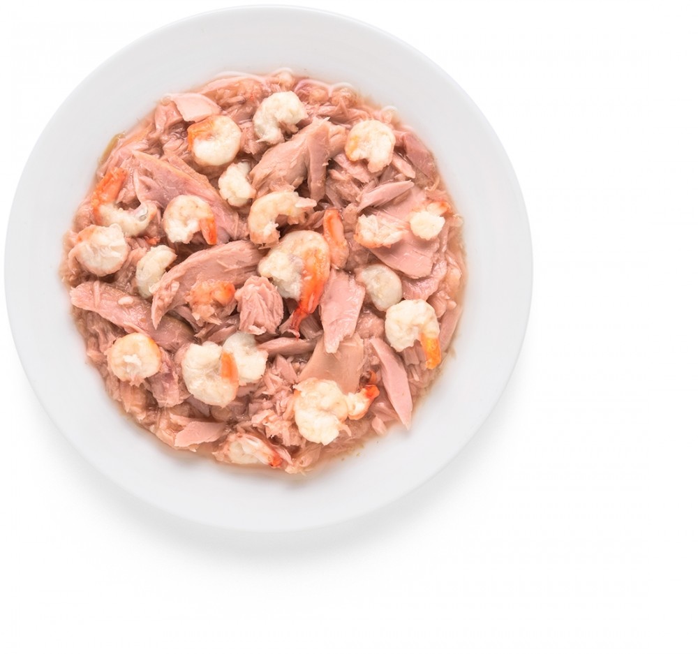 Полностью натуральное питание для кошек из отборного рыбного филе и мяса креветок класса HUMAN GRADE, приготовленное в собственном соку.
