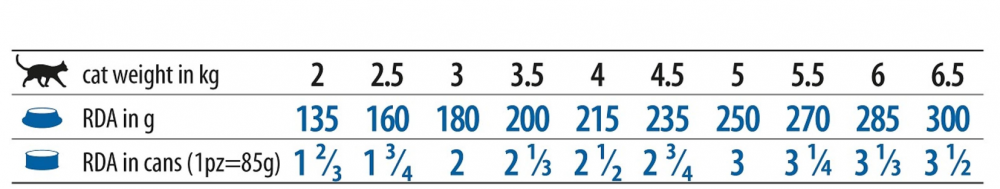 Сырой белок 15,00%; сырые жиры и масла 5,70%; сырая клетчатка 2,60%; сырая зола 2,60%; влага 71,50%; кальций 0,30%; фосфор 0,25%; крахмал 2,00%; всего сахара 0,80%; натрий 0,16%; калий 0,24%; жирные кислоты Омега-6 1,00%; жирные кислоты Омега-3 0,60%; ЭПК 0,15%; ДГК 0,15%.