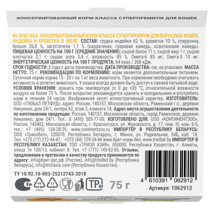 БРИТ КЕА, Ламистер для взрослых кошек, Индейка и Креветки: ЖЕЛЕ 75 г
