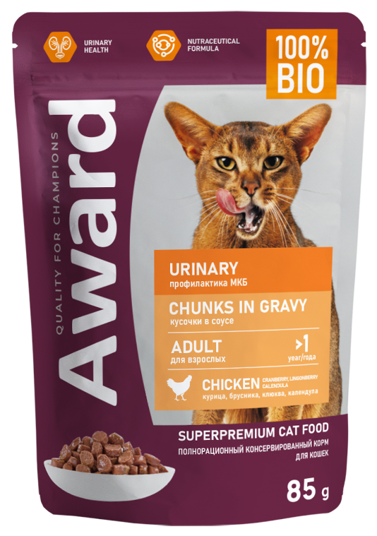 Влажный корм AWARD Urinary для профилактики мочекаменной болезни у взрослых кошек кусочки в соусе с курицей 85г