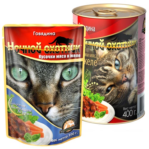 Консервированные корма НОЧНОЙ ОХОТНИК разработаны с учетом возрастных особенностей животных. Благодаря правильному подбору и соотношению в кормах мясных продуктов и злаков консервированные корма имеют высокую питательную ценность и прекрасные вкусовые качества.