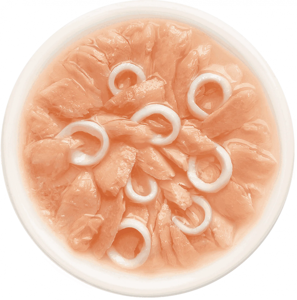 Состав: лосось 54 %, кальмар 6 %, бульон из лосося 38 %, натуральная желирующая добавка.nПищевые добавки: пивные дрожжи (источник пребиотика МОС), пребиотик ФОС, рыбий жир (анчоус), витамин Е, таурин, минералы.nПищевая ценность, %: протеин — 8,5, жиры — 2,5, клетчатка — 1, зола — 1,5, влажность — 89; энергетическая ценность — 65 ккал.