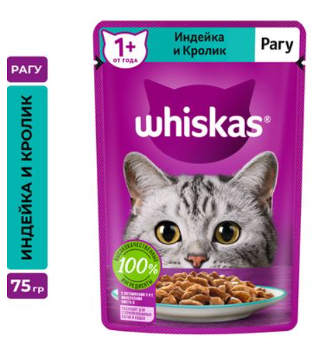 Это сбалансированный рацион, приготовленный так, как любит ваша кошка. Аппетитное рагу с индейкой и кроликом в густом соусе обязательно понравится вашей любимице. Жизнь замуррчательна, ведь рацион Whiskas® содержит все необходимое, чтобы еда вашей кошки была не только вкусной, но и полезной. Whiskas® поддержит иммунитет, позаботится