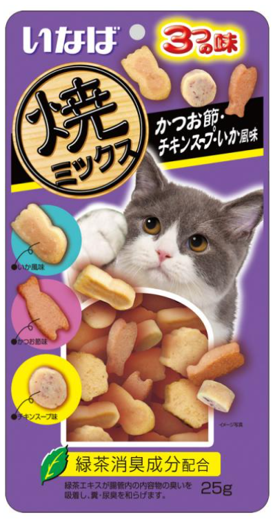 Лакомство запеченное INABA Yakimiksu ассорти для кошек со вкусом кацуобуси, куриного бульона и кальмара, 25 г