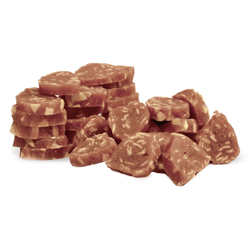 Состав: мясо ягненка – 59%, мясо трески – 22,7%, крахмал – 6,5%, растительный белок – 4%, сорбитол – 4%, глицерин – 3,5%