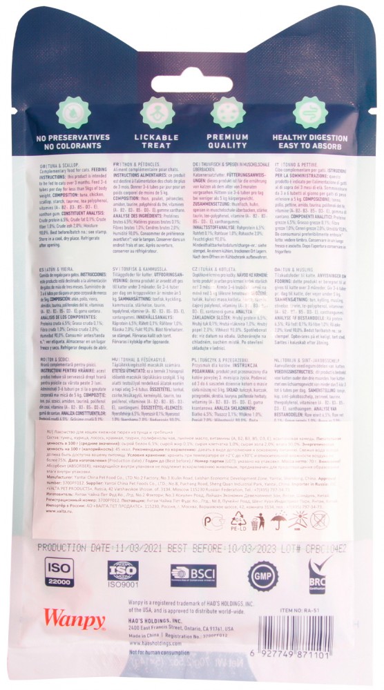Wanpy Лакомство Cat «нежное пюре» из тунца и гребешка, для кошек, 70 г.