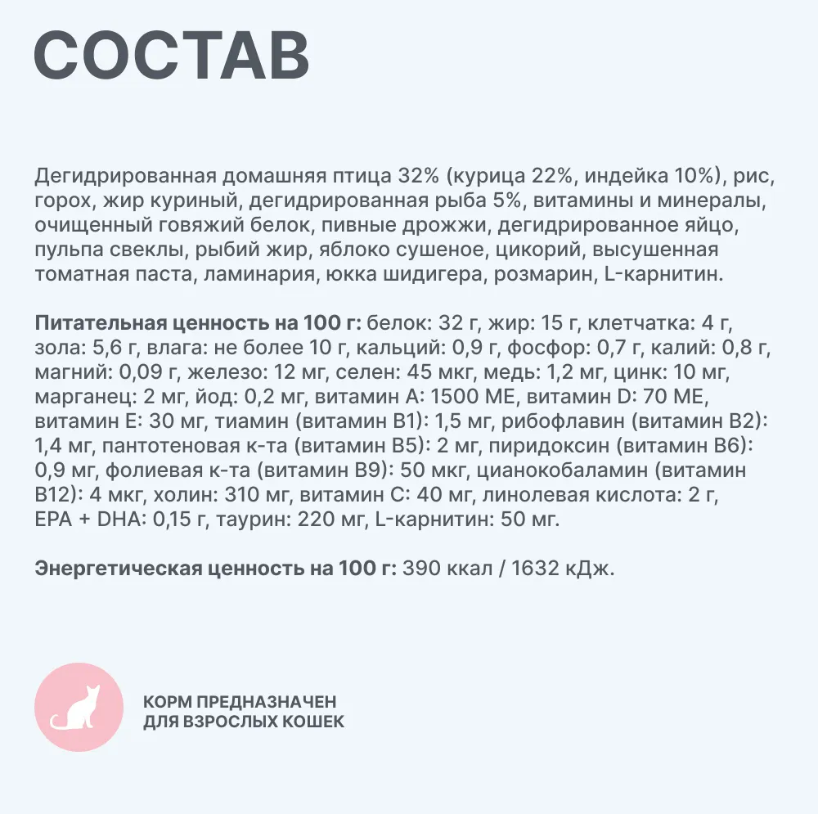 Улучшенная формула: еще больше животного белка и полезных ингредиентов! Полнорационный корм с высоким содержанием животного белка — идеальное выражение вашей заботы о своем питомце. Сбалансированная формула из полностью натуральных ингредиентов помогает контролировать вес и поддерживать здоровье и активность вашей кошки день за днем. Преимущества: 78,5% высококачественного животного белка в составе. Этот показатель рассчитан ветеринарными диетологами и позволяет обеспечивать организм кошки необходимыми аминокислотами без избыточной нагрузки на почки. Горох в составе обладает низким гликемическим индексом, что позволяет контролировать уровень сахара в крови и способствует профилактике диабета. Это особенно важно для животных с избыточным весом. Натуральная клетчатка (из яблока, свеклы и томатов) мягко стимулирует желудочно-кишечный тракт и способствует более полному усвоению корма за счет пектина. Ламинария — источник натурального йода, необходимого для поддержания функции щитовидной железы, здоровья кожи и шерсти. Томаты — дополнительный источник антиоксидантов, витаминов и холина, способствующего снижению уровня холестерина в крови. Пребиотики для поддержания микрофлоры кишечника и иммунной системы. Баланс витаминов и минералов для поддержания нормального функционирования всех систем организма. Отсутствие в составе синтетических консервантов, ароматизаторов, усилителей вкуса и ГМО. Соответствие нормам по кормам FEDIAF, NRC и российскому ГОСТу Р 55453-2022.Состав Дегидрированная домашняя птица 32 % (курица 22 %, индейка 10 %), рис, горох, жир куриный, дегидрированная рыба 5 %, витамины и минералы, очищенный говяжий белок, пивные дрожжи, дегидрированное яйцо, пульпа свеклы, рыбий жир, яблоко сушеное, цикорий, высушенная томатная паста, ламинария, юкка шидигера, розмарин, L-карнитин. Энергетическая ценность на 100 г: 390 ккал / 1632 кДж. Подробнее