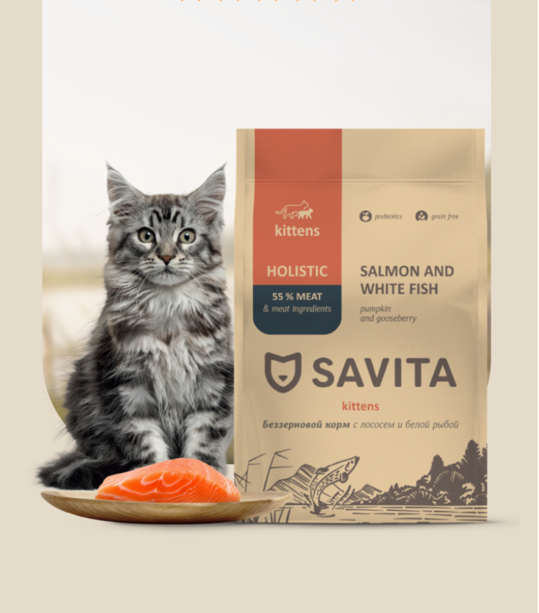 Полнорационные и сбалансированные корма Savita класса холистик содержат высокий процент мясных ингредиентов, необходимых витаминов и минералов, без добавления зерновых культур