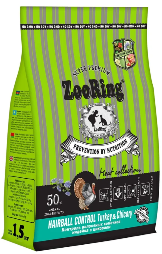 Корм Зооринг ВЫВОД ШЕРСТИ ИНДЕЙКА с Цикорием для кошек 1,5 кг