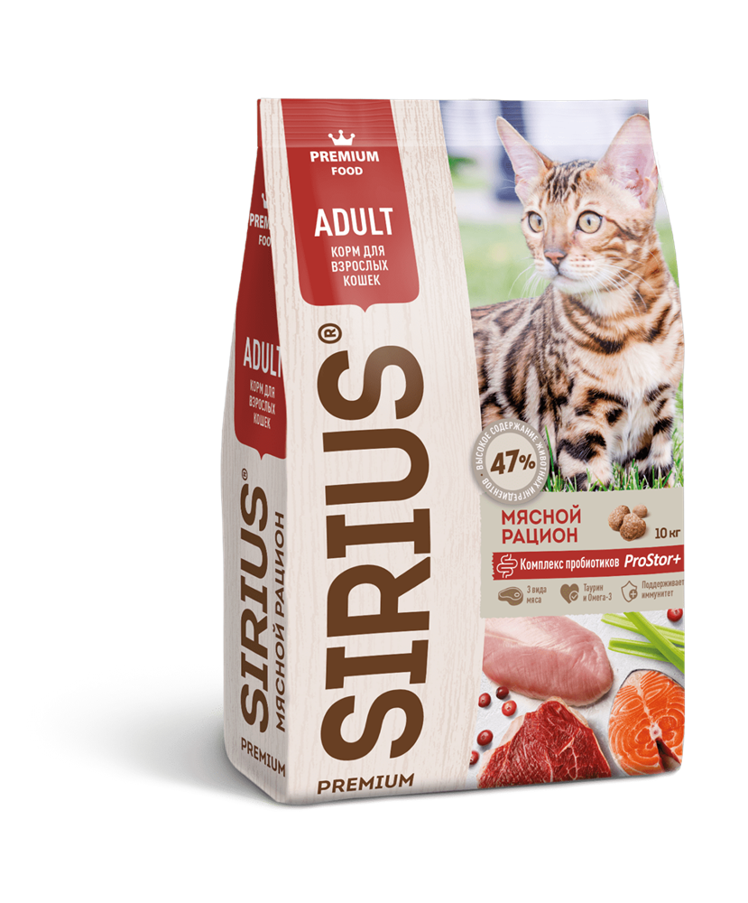 Корм SIRIUS "Мясной рацион" для взрослых кошек.