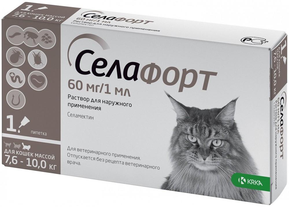 СелаФорт (KRKA) капли на холку для кошек весом менее 7.6-10 кг, от блох, клещей, вшей и власоедов, 1 пипетка по 1 мл
