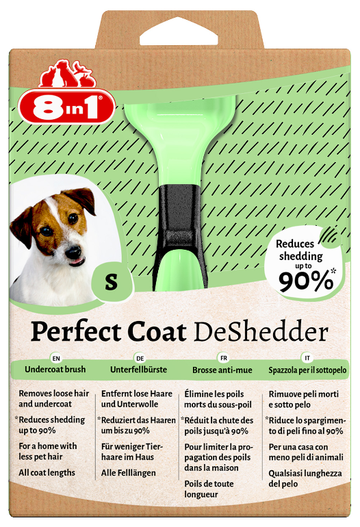 Дешеддер 8in1 Perfect Coat S для мелких собак. Лезвие дешеддера захватывает и вытаскивает слабо прикрепленные волоски подшерстка еще до их выпадения, сокращая линьку собаки до 90%. Благодаря дешеддеру 8in1, вы забудете о выпавшей шерсти в доме, а ваш питомец будет выглядеть ухоженно. При правильном применении дешеддер 8in1 эффективен на всех