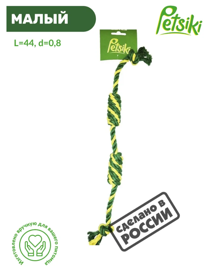 Игрушка для собак Сарделька канатная двойная Petsiki Петсики малая (желтый-зеленый-зеленый), длина 44 см (канат для собак)