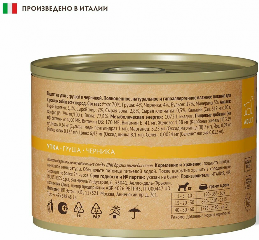 В составе консервов используются только натуральные и качественные ингредиенты, такие как утка, груша и черника. Благодаря этому, паштет обладает изысканным вкусом и привлекательным ароматом, который обязательно понравится вашему питомцу.