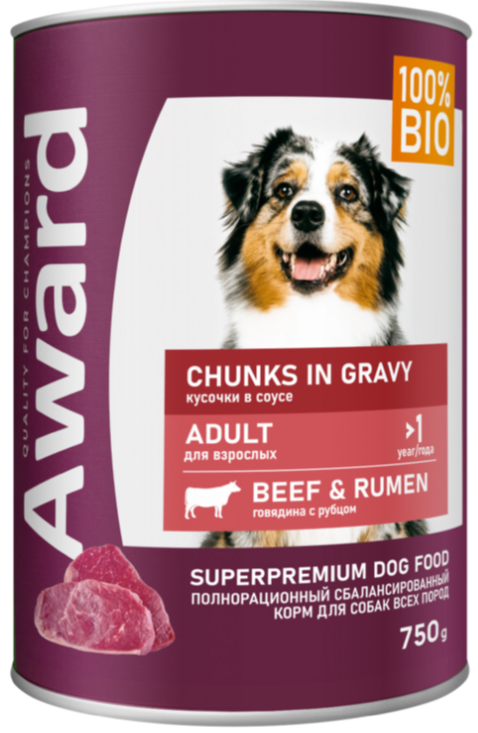 Влажный корм AWARD для взрослых собак кусочки с говядиной и рубцом в соусе 750 г