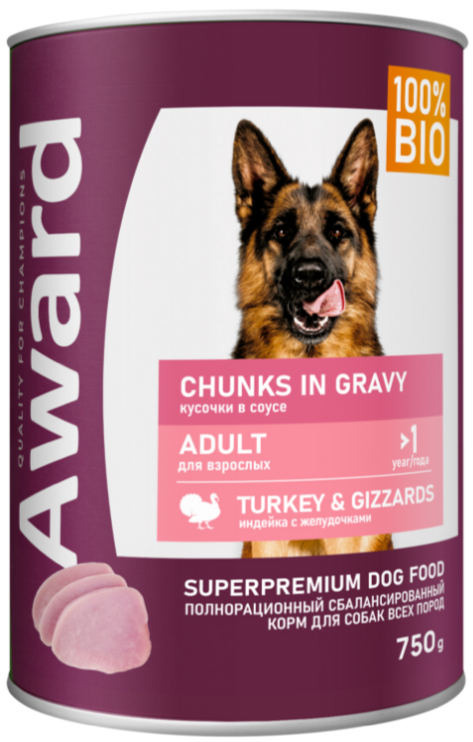 Влажный корм AWARD для взрослых собак кусочки с индейкой и желудочками в соусе 750г