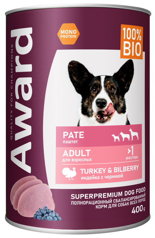 Влажный корм AWARD для взрослых собак паштет из индейки с черникой 400 г