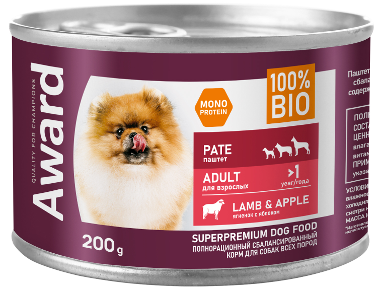 Влажный корм AWARD для взрослых собак паштет из ягненка с яблоком 200г