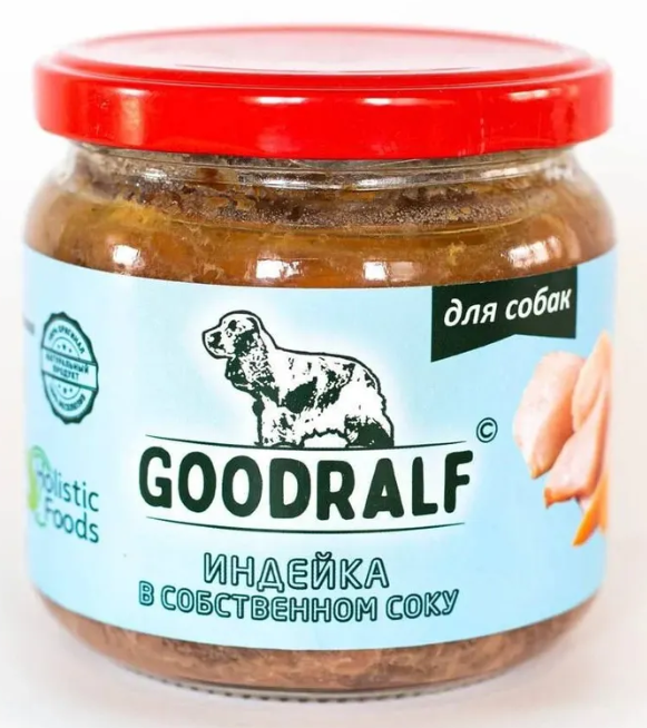 Влажный корм ПРЕМИУМ ГудРальф Индейка в собственном соку стеклянная банка 340 гр