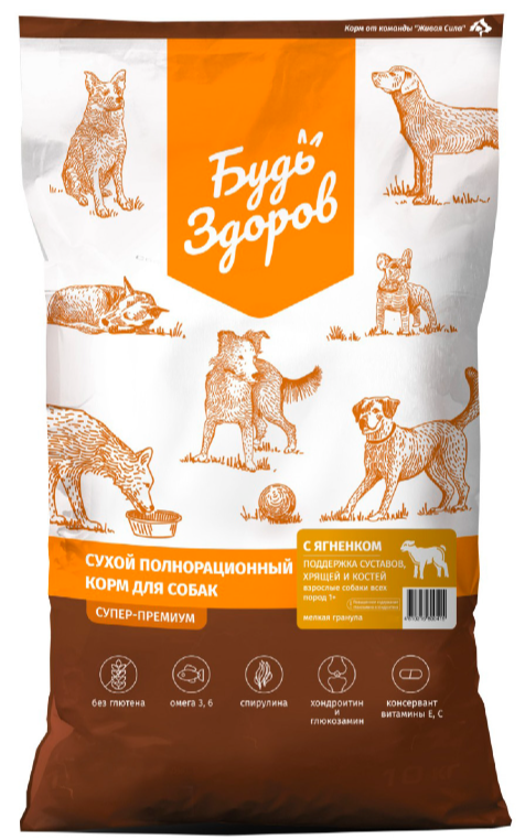 Корм Будь Здоров (Живая сила) Супер-Премиум (крупная гранула) для собак, поддержка суставов, хрящей и костей, повышенное содержание глюкозамина и хондроитина, с ягнёнком, 10 кг