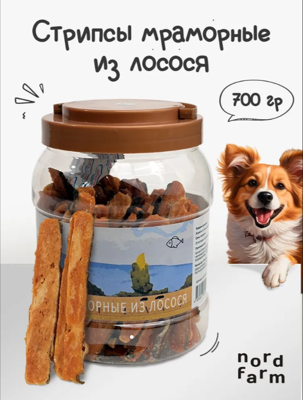 аппетитной мраморной текстурой. Полоски из лосося богаты омега-3 жирными кислотами, которые способствуют здоровью кожи и шерсти вашей собаки. Кроме того, оно помогает укрепить иммунную систему и поддерживает общее состояние здоровья вашего питомца.