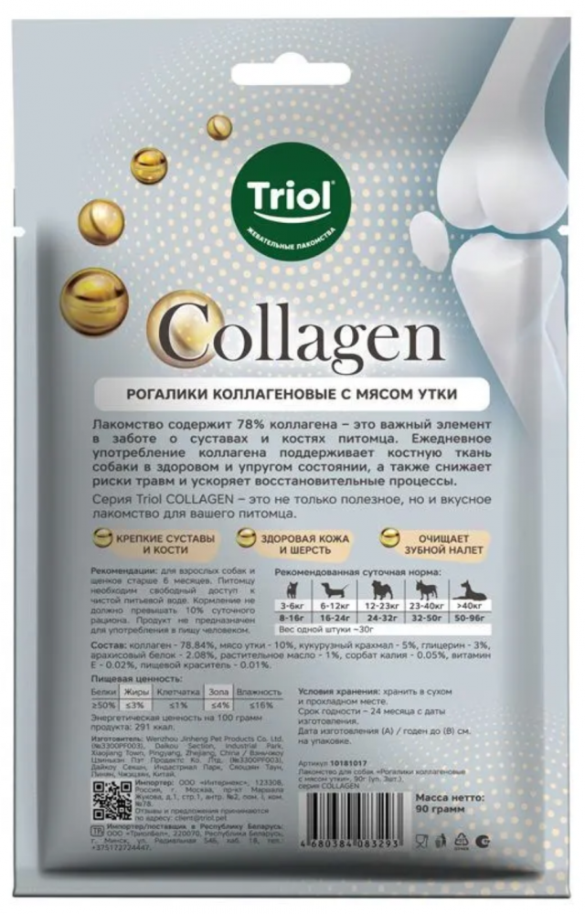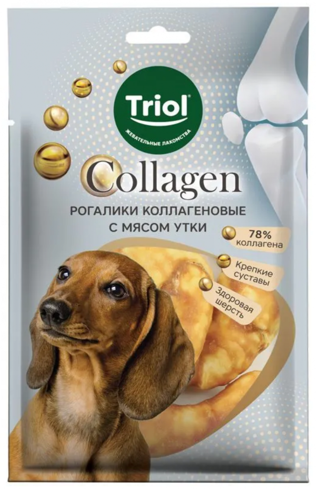 Лакомство содержит 78% коллагена - это важный элемент в заботе о суставах и костях питомца. Ежедневное употребление коллагена поддерживает костную ткань собаки в здоровом и упругом состоянии, а также снижает риски травм и ускоряет восстановительные процессы. Серия Triol COLLAGEN – это не только полезное, но и вкусное лакомство для вашего