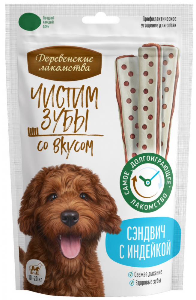 Супер-жевательное лакомство Сэндвич с индейкой эффективно удаляет зубной налёт, предотвращая образование зубного камня.