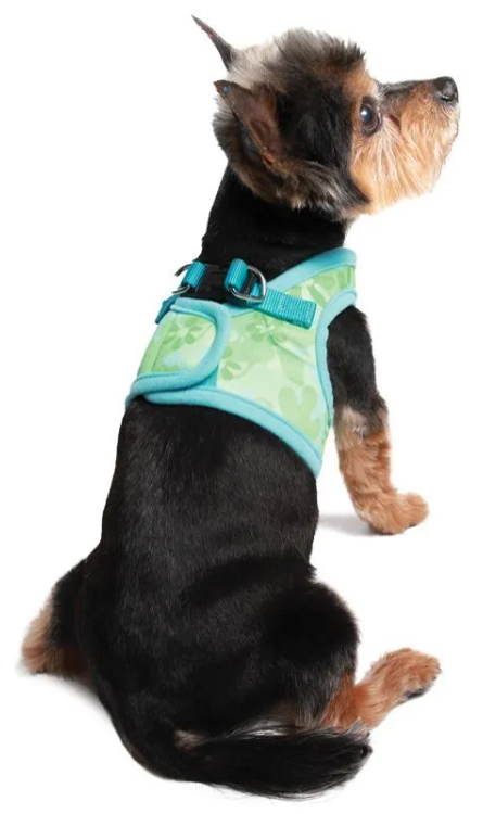 на теле животного при помощи широкой липучки и удобной пластиковой застежки на спине питомца. Изделие легкое, поэтому питомец не будет испытывать дискомфорт при носке. Размер шлейки: M (обхват груди 450мм). Цвет: голубо-зеленый.