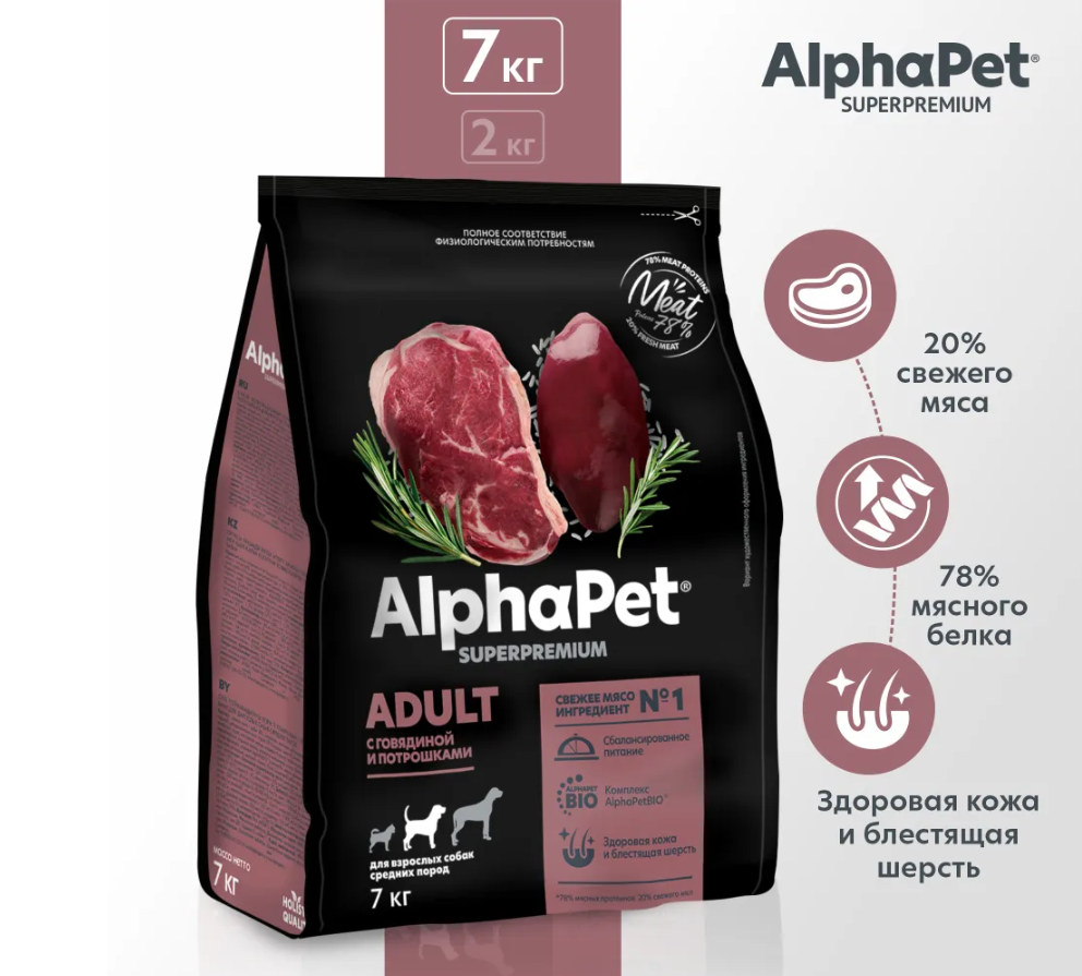 Сухой корм Alphapet Superpremium Adult с говядиной и потрошками для собак средних пород