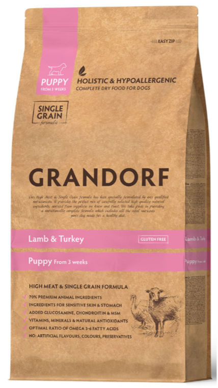 Корм Grandorf PUPPY ALL BREEDS LAMB & TURKEY для щенков всех пород от 3 недель, беременных и кормящих сук (низкое содержание зерна), ягненок с индейкой