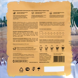 Протеин - 25%, жир - 15%, влажность - не более 9%, зола - 7,5%, омега-6 - 2,74%, клетчатка - 2,53%, лизин - 1,7%, кальций - 1,3%, фосфор - 0,9%, метионин и цистин - 0,8%, калий - 0,6%, натрий - 0,3%, омега-3 - 0,25%, триптофан - 0,2%.