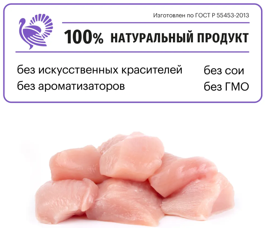 Дегидрированное мясо (в т.ч. индейка), цельные злаки, животный жир (в т.ч. лососевый, консервированный витамином E), растительная клетчатка, высокоусвояемый растительный белок, гидролизованные мясные белки, пивные дрожжи (источник маннанолигосахаридов), витаминно-минеральный комплекс, Юкка Шидигера, морская капуста, пробиотики (Bacillus subtilis, Bacillus licheniformis), сушеное яблоко. Cохранено витамином С и природным токоферолом (источник натурального витамина Е).