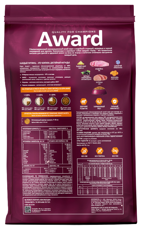 Сухой корм AWARD для щенков от 1 мес, беременных и кормящих сук средних пород с индейкой и курицей с добавлением моркови и черной смородины