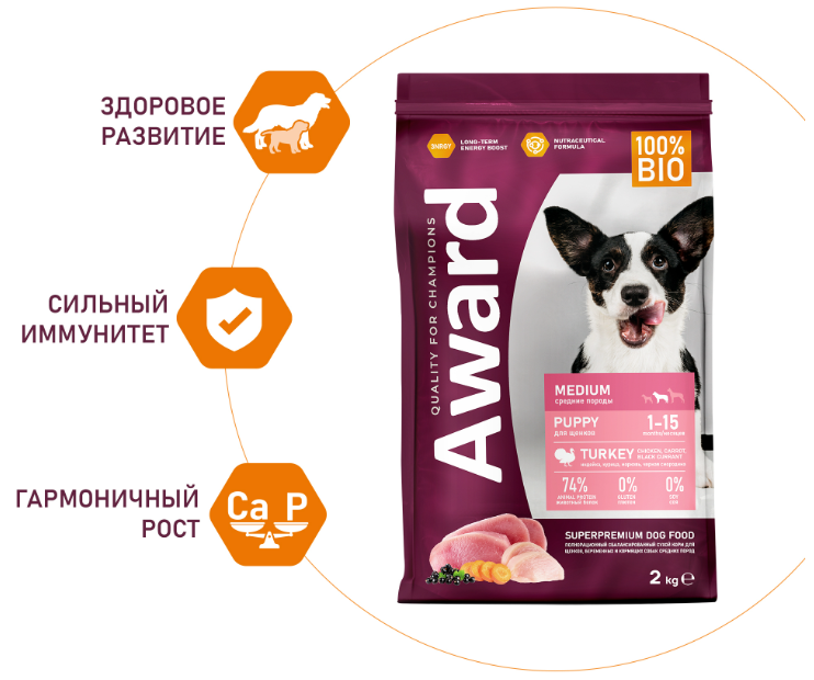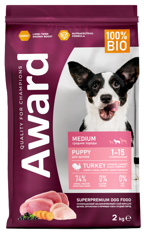 Сухой корм AWARD для щенков от 1 мес, беременных и кормящих сук средних пород с индейкой и курицей с добавлением моркови и черной смородины