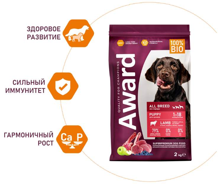 Сухой корм AWARD для щенков от 1 месяца, беременных и кормящих сук всех пород с ягненком и индейкой с добавлением яблока и черники