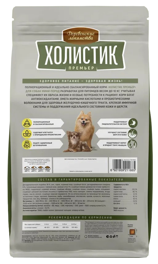 Корм Деревенские лакомства Холистик Премьер для собак малых пород, индейка с рисом 1 кг