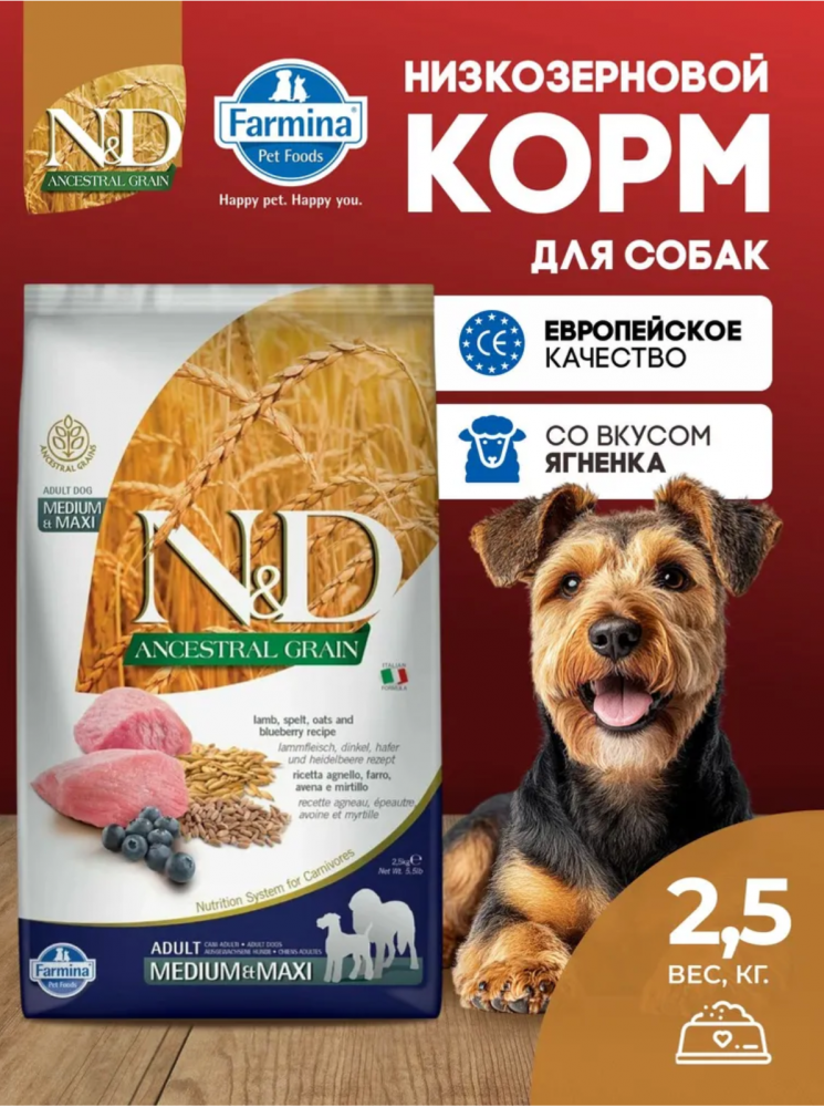 Сухой корм для собак Farmina ND низкозерновой для средних и крупных пород с ягненок с черникой