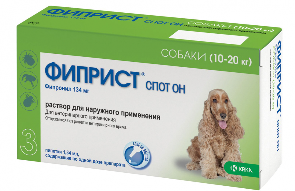 Фиприст Спот Он (KRKA) капли на холку для собак весом 10-20 кг, от блох, клещей, вшей и власоедов, 3 пипетки по 1.34 мл, 4.02 мл
